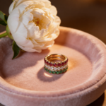 18K gold non-tarnish CZ eternity ring crafted in stainless steel. Available in gold, green, and pink —