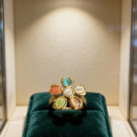floral arrangement of multi-toned stones set in textured gold frames, this size 7 ring delivers