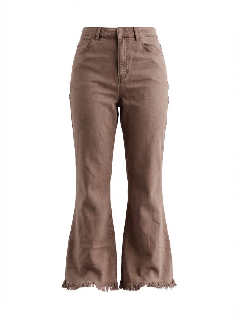 High-waist acid washed bootcut pants featuring a cropped length and frayed hem finish. Designed with