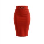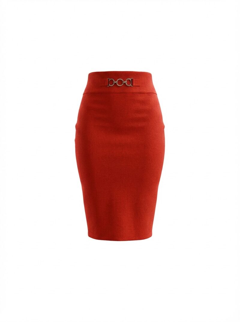 High-waist stretch pencil skirt with elegant gold-tone belt detail and a smooth look.