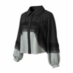 A modern statement blouse featuring sheer shadow mesh contrast and soft denim-inspired paneling for