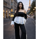 movement and dimension. Paired with high-waisted, wide-leg pants featuring contrast side panels,