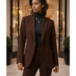 A tailored brown slim-fit boyfriend blazer featuring a sleek one-button closure and structured silhouette