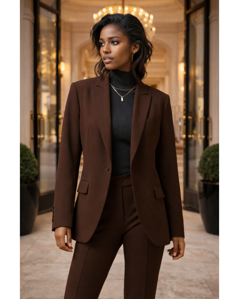 The Brown Long Slim One Button Boyfriend Blazer blends modern structure with rich, timeless
