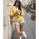 A playful yet polished knit cardigan featuring bold colorful heart-shaped buttons, designed to add charm