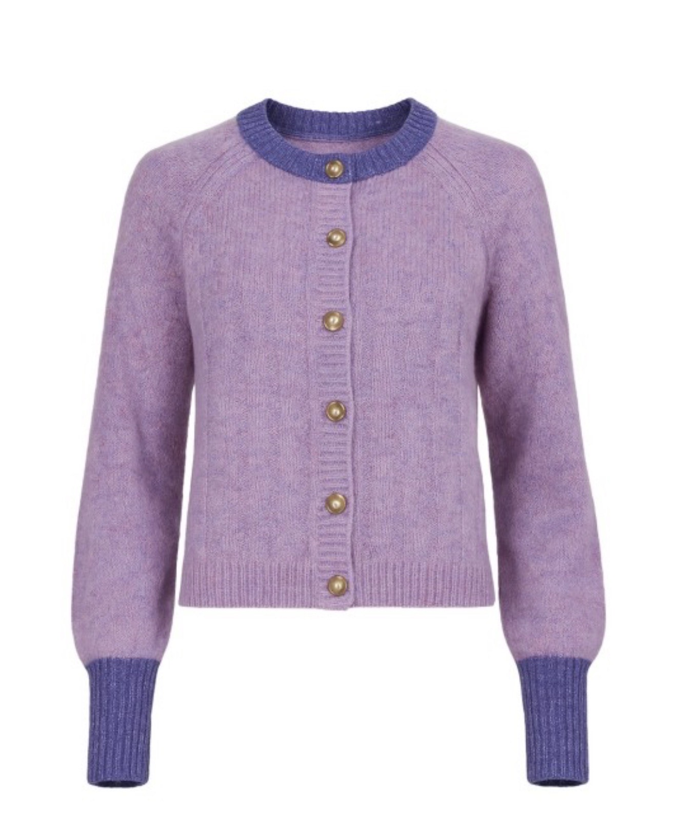 Designed with classic raglan sleeves and contrast trim detailing at the neckline and cuffs, this cardigan