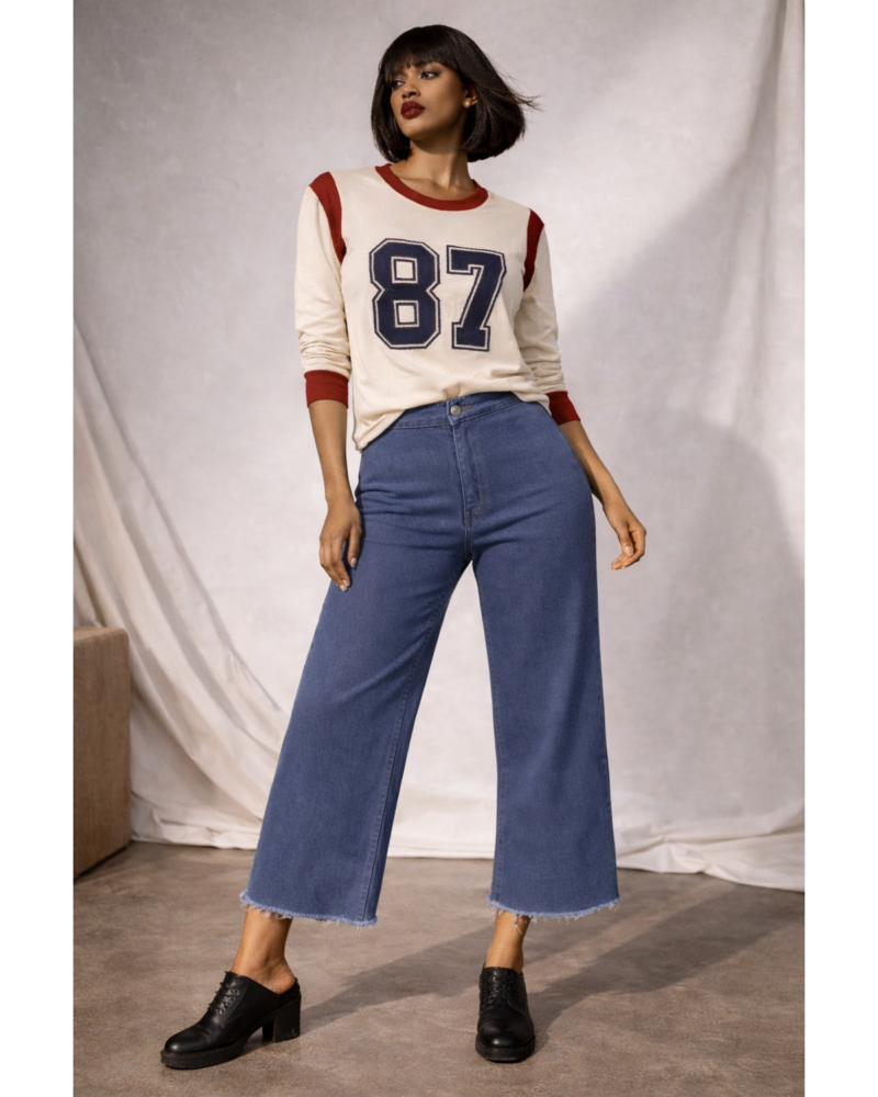 The Cream & Rouge Graphic Embroidered Contrast Long Sleeve Tee blends casual comfort with