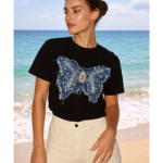Women’s black graphic t-shirt featuring a statement denim butterfly design accented with pearl and