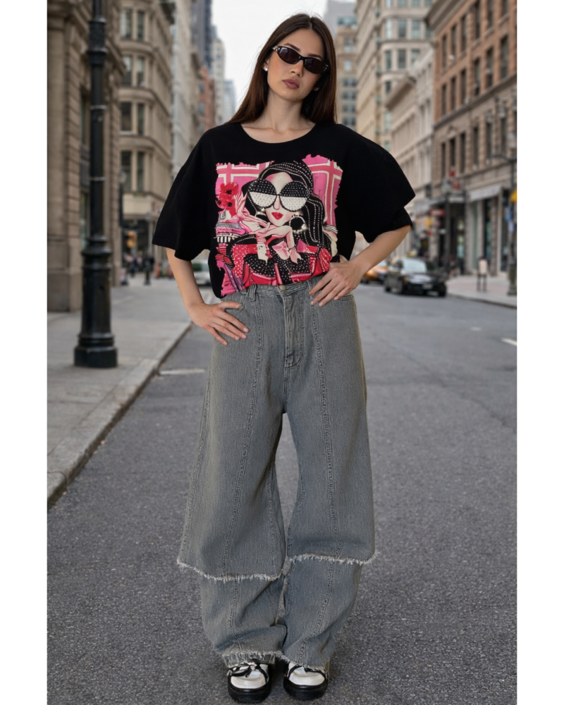 A bold statement tee featuring a glamorous fashion icon graphic with pearl-studded shades and chic