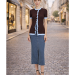 denim, this skirt features a clean midi-length silhouette with a front slit that adds movement and a