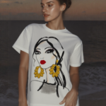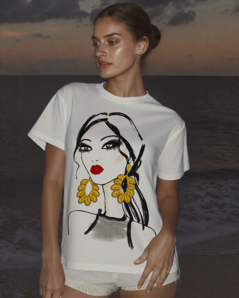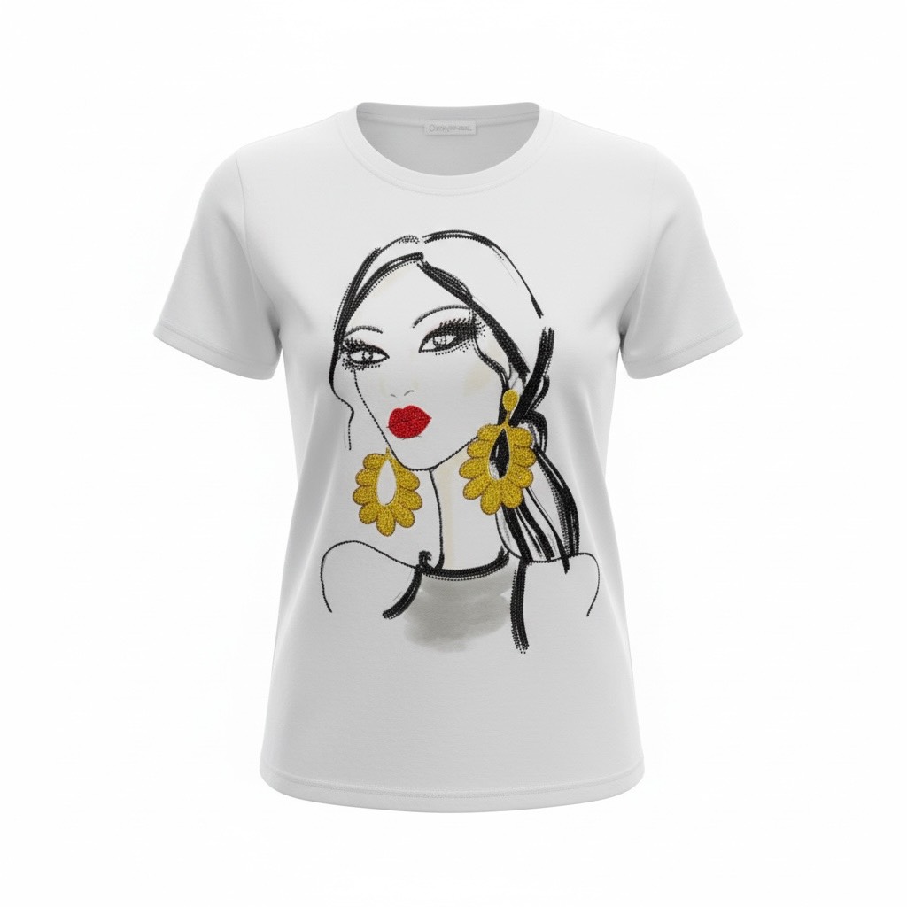 Boutique women’s white graphic t-shirt with elegant woman face artwork and statement details.