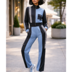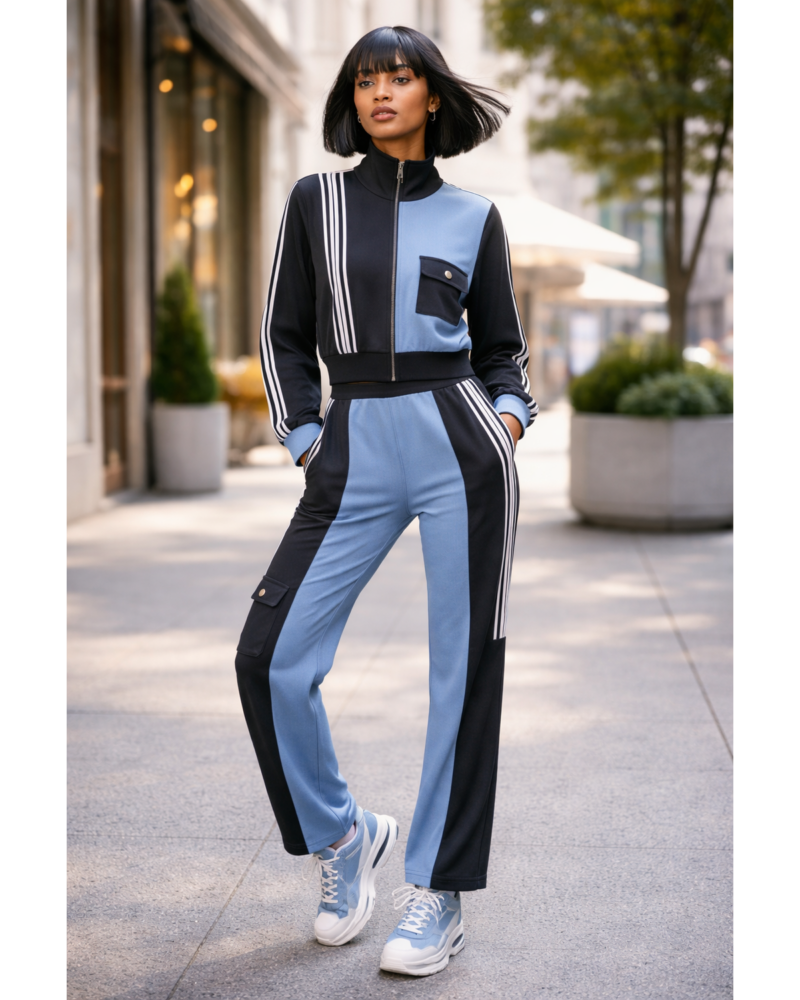 black and denim-inspired colorblock design, this two-piece set delivers high-impact style with