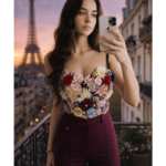 A statement-making bustier featuring intricate 3D floral appliqué detailing, designed to sculpt the