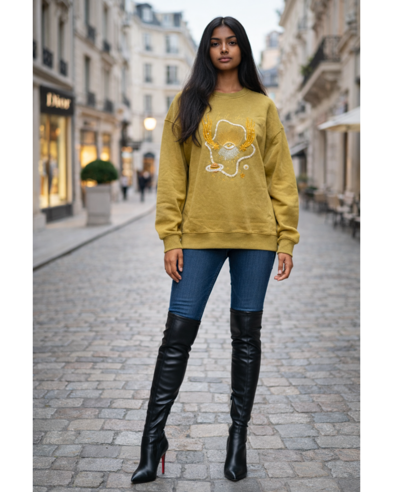 This statement sweatshirt features a mystical eye graphic accented with shimmering rhinestones