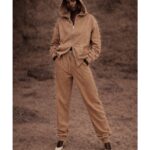 pant seams, creating a refined contrast against the rich praline tone. The hooded jacket offers a