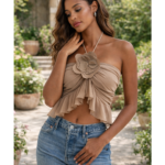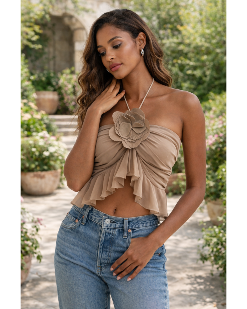 The Petal Halter Ruffle Top in taupe is a romantic statement piece with a modern edge. Designed with a halter tie neckline and two secure buttons at the back, it features cascading chiffon ruffles that create a soft peplum effect at the waist. The center floral appliqué adds a delicate, feminine touch, while the open back keeps the look sleek and elevated. Its neutral taupe tone makes it effortlessly versatile—perfect for dressing up or styling down for everyday chic.
