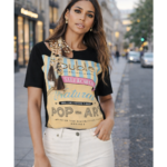 The Pop Art Bow Front Graphic Tee brings playful glamour to your everyday wardrobe. Designed with a