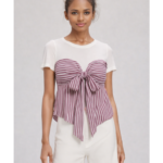 with a striped overlay and a dramatic front ribbon bow detail that creates a flattering, feminine silhouette. The