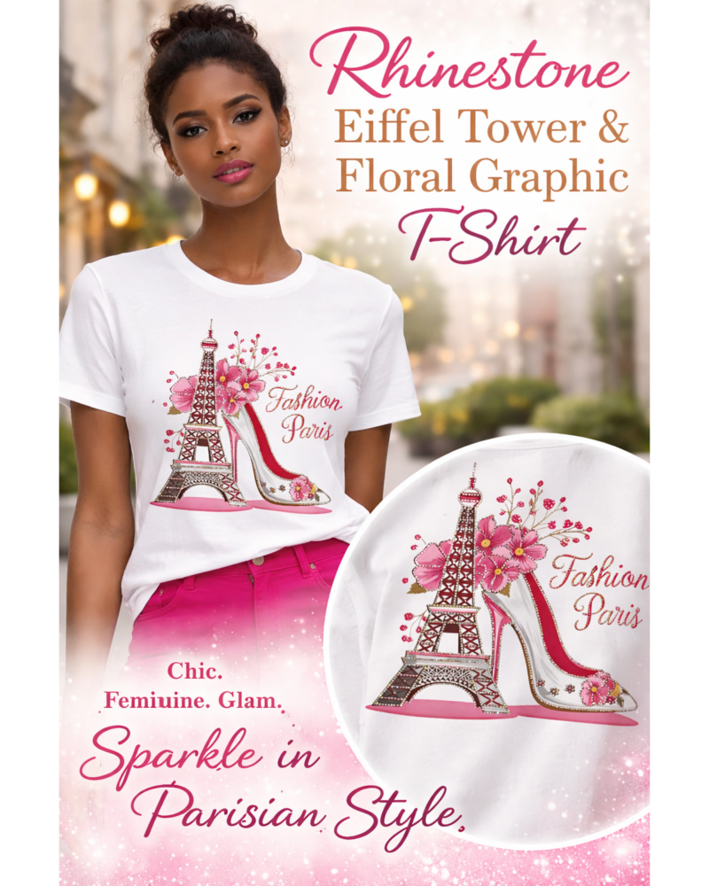 Inspired by the romance of Paris and the confidence of modern women, this rhinestone graphic tee captures elegance, femininity, and bold style in one effortless look. Perfect for the girl who loves to shine wherever. Chic meets sparkle in this Paris-inspired rhinestone graphic tee designed to elevate your everyday look.