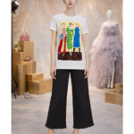 Women’s fashion graphic tee featuring rhinestone-accented outfit details. Soft cotton blend with