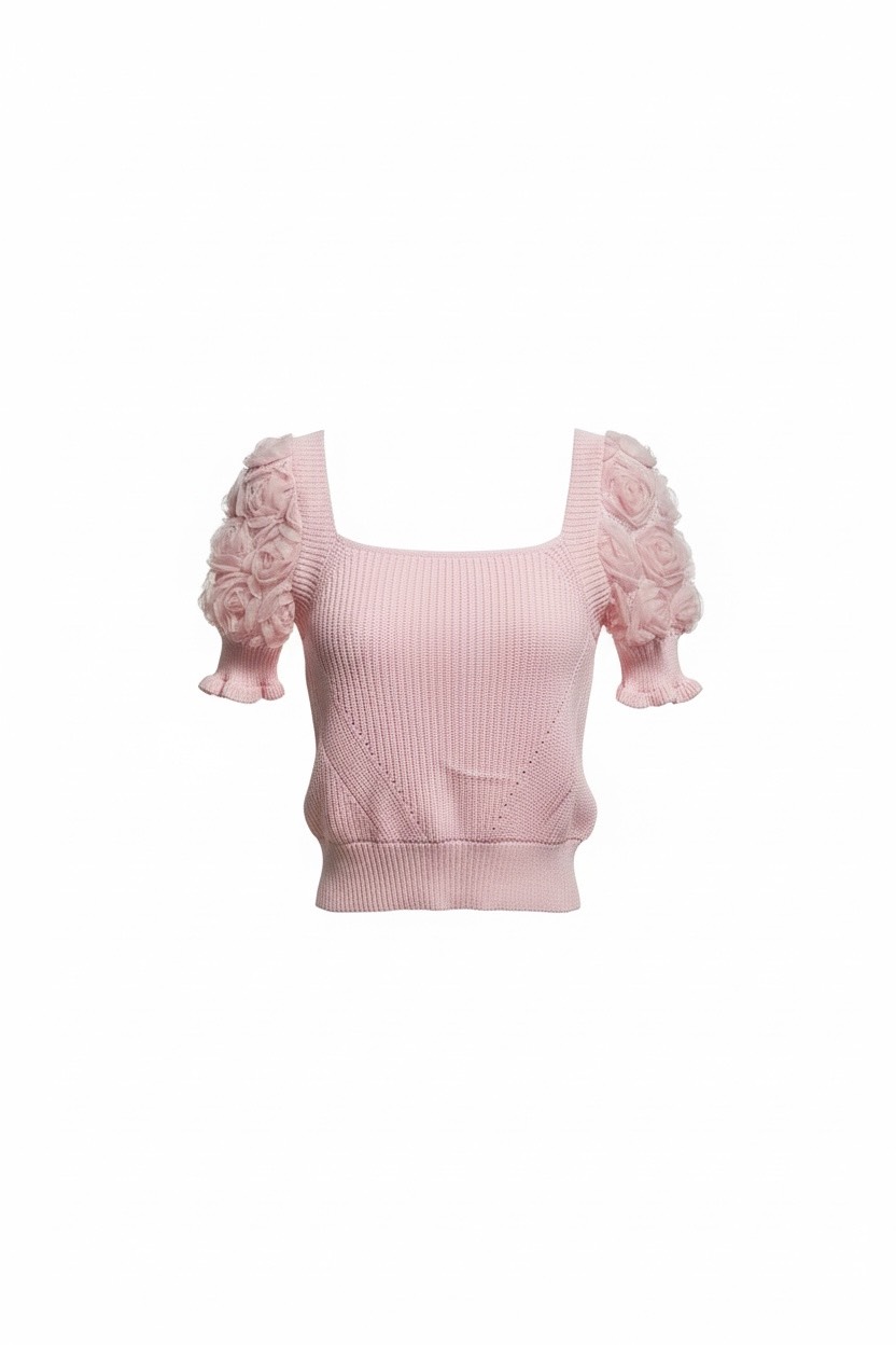 Romantic knit top featuring 3D rose puff sleeves, a flattering square neckline, and a soft stretchy fit.