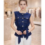 The Snobby Signature Belted Denim Vest blends modern structure with effortless boutique style. Featuring clean contrast stitching and elegant gold tone buttons, this piece adds a refined touch to a classic denim-inspired silhouette. The crew neckline and chest flap pockets give the vest a tailored look while the adjustable self-tie belt creates a flattering waist-cinching fit. Crafted from a comfortable stretch blend fabric, it offers flexibility while maintaining a sleek shape. This versatile piece pairs perfectly with jeans, trousers, or skirts for a polished day-to-night outfit. True to size. Model is wearing size Small. Fabric: 80% Polyester, 15% Rayon, 5% Spandex.