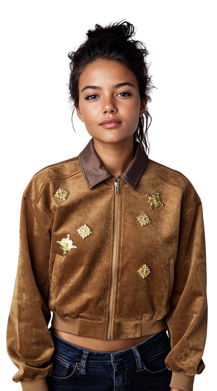 A luxe suede-look bomber jacket finished with sparkling rhinestone embellishments for a bold, elevated