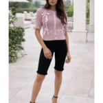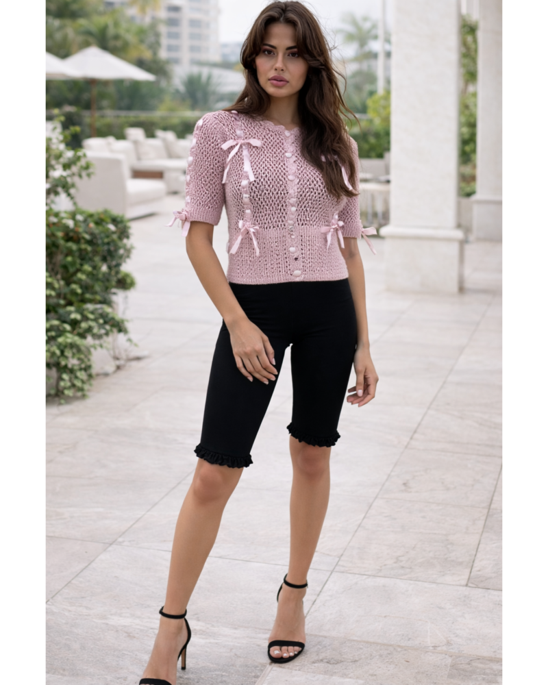 Designed for the woman who embraces soft femininity with a polished edge, the Blush Ribbon Muse Cardigan is a delicate statement piece crafted with refined detail. This all-season knit features beautifully placed satin ribbon bows that add a playful yet elevated touch to its classic silhouette. The scalloped edges along the neckline and hem enhance its romantic feel, while the covered button closure keeps the look seamless and sophisticated. Finished with short, slightly puffed sleeves, this cardigan creates a soft, flattering shape that pairs effortlessly with skirts, denim, or tailored bottoms for a look that feels both graceful and modern.