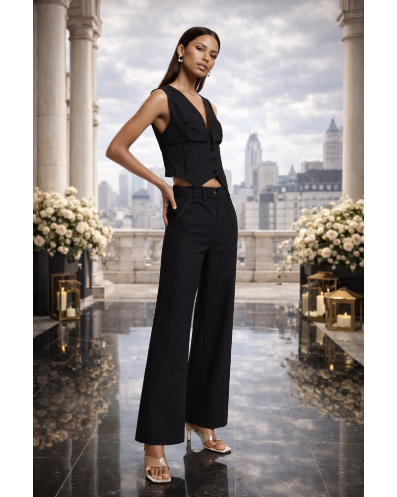 The Noir Muse Pinstripe Pants were created for the woman who commands attention without saying a word. With every step, the tailored silhouette and flowing wide-leg design reflect confidence, control, and undeniable elegance. This is not just a look — it’s a statement of who you are becoming. Tailored pinstripe pants designed to elongate the silhouette with a sleek, powerful finish.