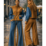 Turn everyday style into a statement with the Snobby Downtown Denim Set. This fashion-forward two-piece outfit combines modern color block design with a flattering wide-leg silhouette. The camel and denim zip jacket features relaxed sleeves and functional pockets, creating a clean structured look that pairs perfectly with the high-waisted wide-leg pants. Designed to elongate the legs while offering comfortable movement, this set blends effortless street style with boutique sophistication. Style it with chunky combat boots, heels, or sneakers to create multiple looks from one versatile outfit. Perfect for city outings, brunch dates, travel days, or casual luxury styling. Available exclusively at Snobby Design Boutique.