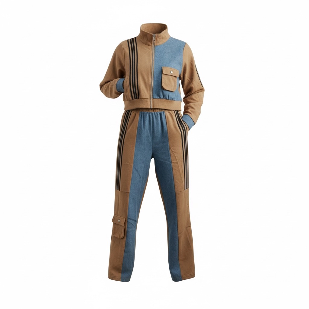 Elevate your off-duty style with this bold two-piece denim contrast set. Designed to blend sporty edge