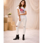 Women’s white graphic t-shirt featuring vintage cola-inspired rhinestone artwork for fun, nostalgic look. This boutique graphic tee offers a soft, comfortable fit with eye-catching sparkle details that elevate everyday style. Perfect for casual wear, pairing with denim, or styling with sneakers for an effortless chic outfit. A must-have statement t-shirt for boutique lovers.