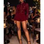 A luxurious  Bordeaux Muse Romper featuring a structured collar, gold button front detail, and belted