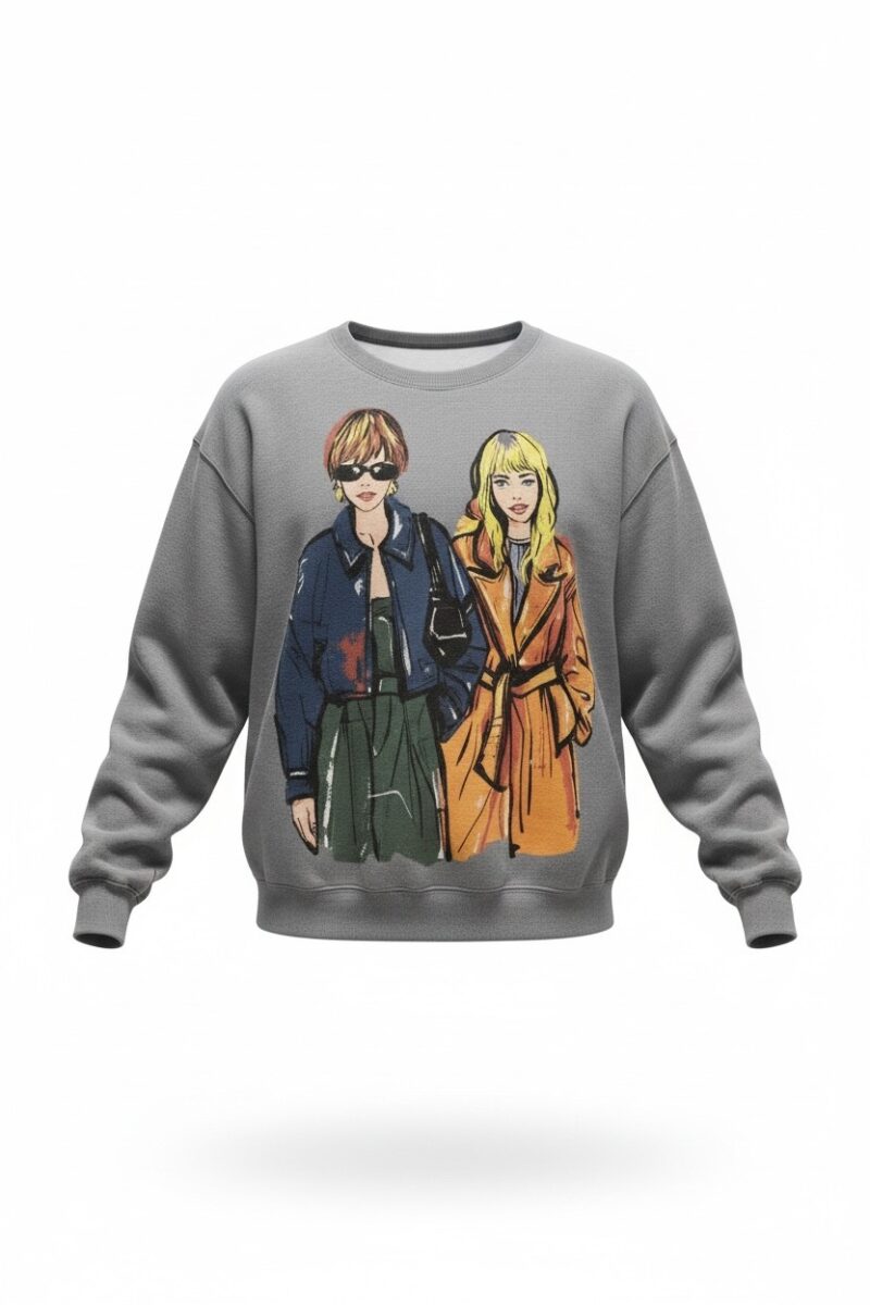 Women’s trendy graphic print sweatshirt featuring a stylish fashion illustration for a modern, street■chic boutique